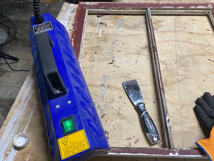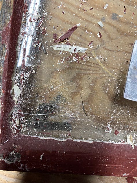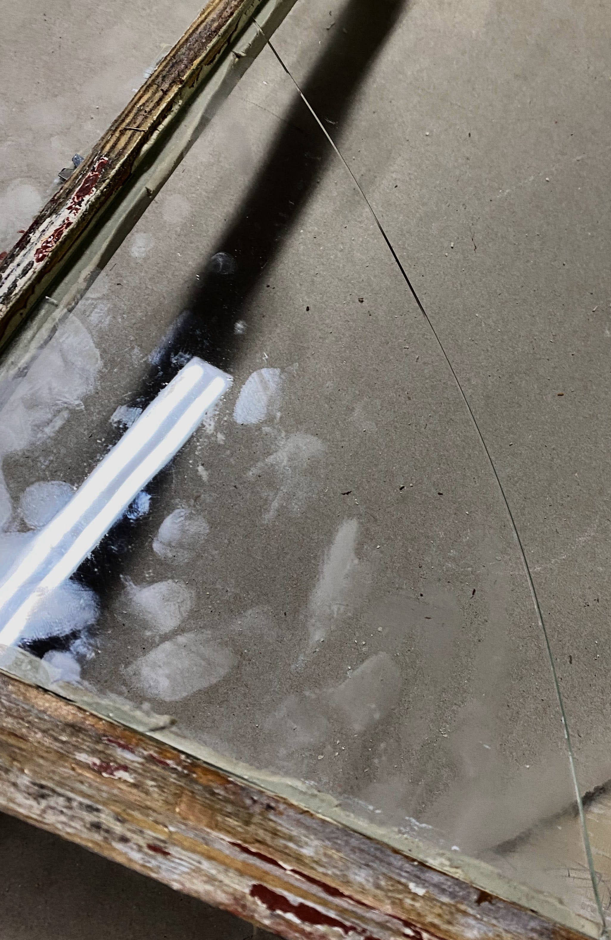 I remembered the multiple heartbreaks of 2023 — as gently as I tried to tackle this project, the the old wavy glass loves to crack or break. Normally these mishaps occur when you were scraping off the putty and paint to extract the glass from the frame, often under the heat lamp. But for the glass to break at this last step of the process was a new low.