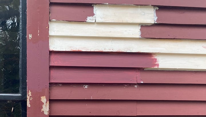 Yes, there is some joy to scraping — particularly when the paint is literally peeling off the siding and all it needs is a nudge to curl into long strips — like the childhood joy of peeling Elmer’s glue off the palms of your hands.