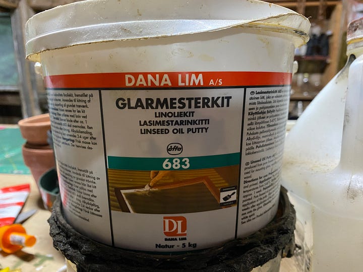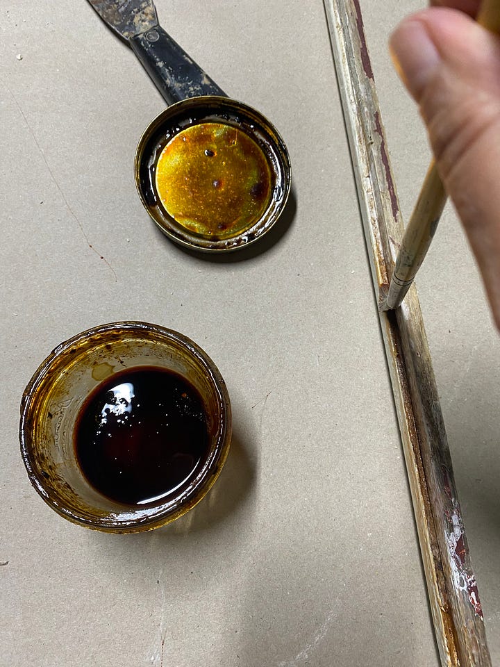 I opened up the linseed oil products, which have so many incredible properties: at first glance it looked like the putty had hardened beyond use, but I was able to peel off the outer skin that had formed, and inside was a perfectly pliable ball of putty. Same with the paint: it looked like it had fully dried out — but we were able to peel back a film that had formed across the top, and underneath was the thick, oily black paint, which we could soften even more with a bit of raw linseed oil from a jug.