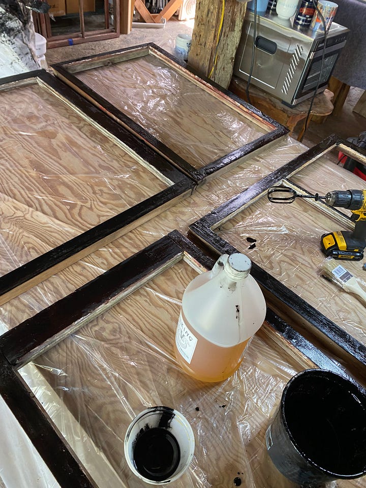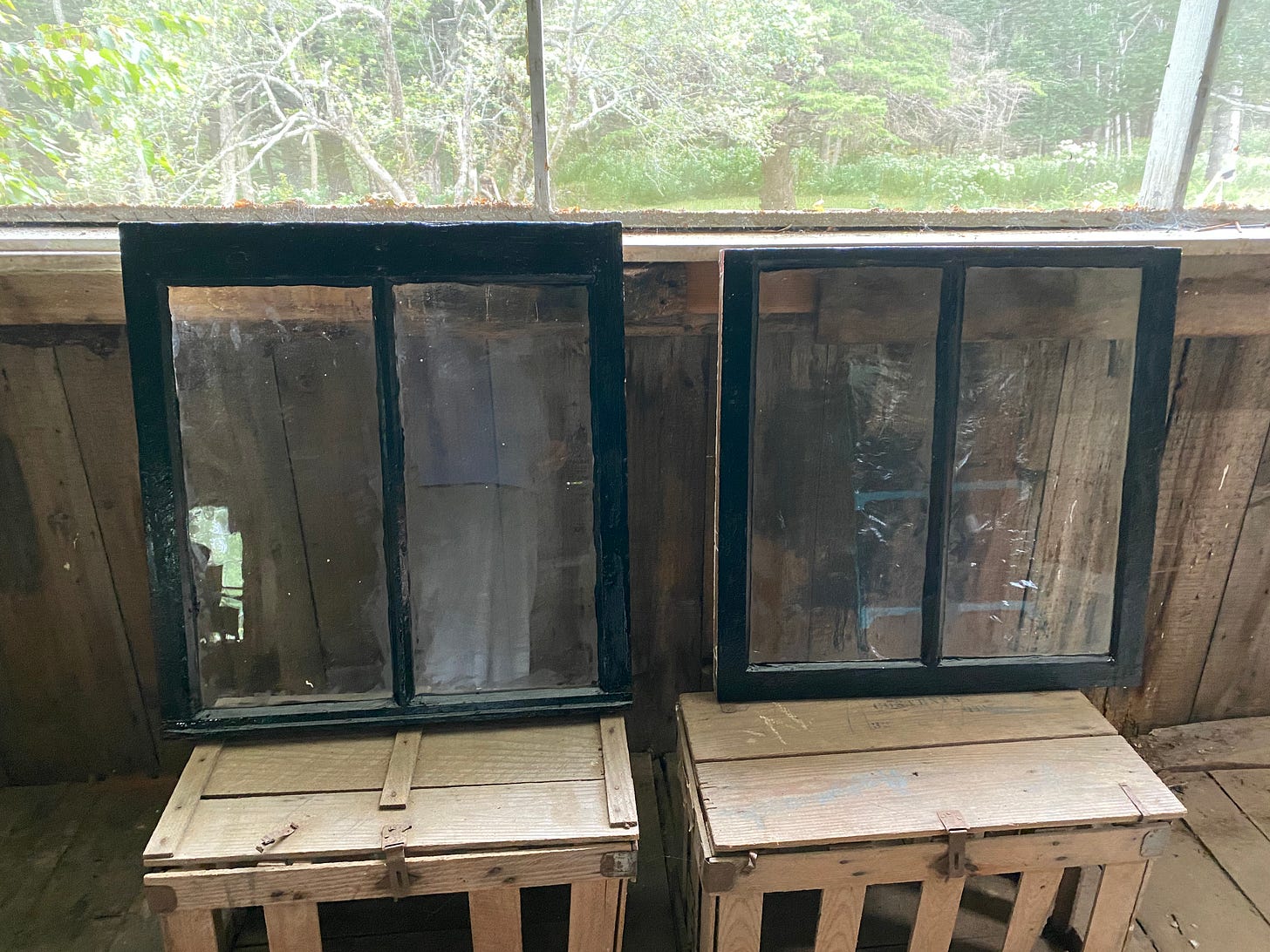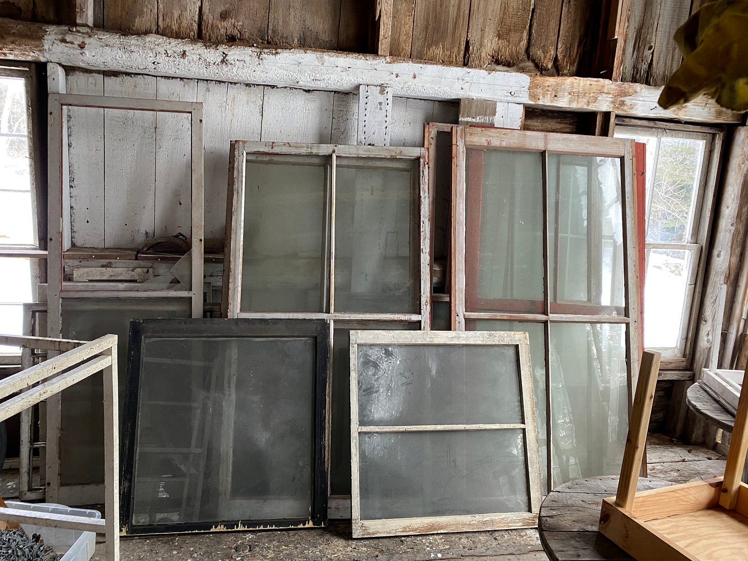 I had mined most of the intact glass panes during the initial window process — finding beautiful wavy glass in some of the old storm windows — sometimes getting it cut to fit in Ellsworth (we tried our hand at cutting glass and failed!).