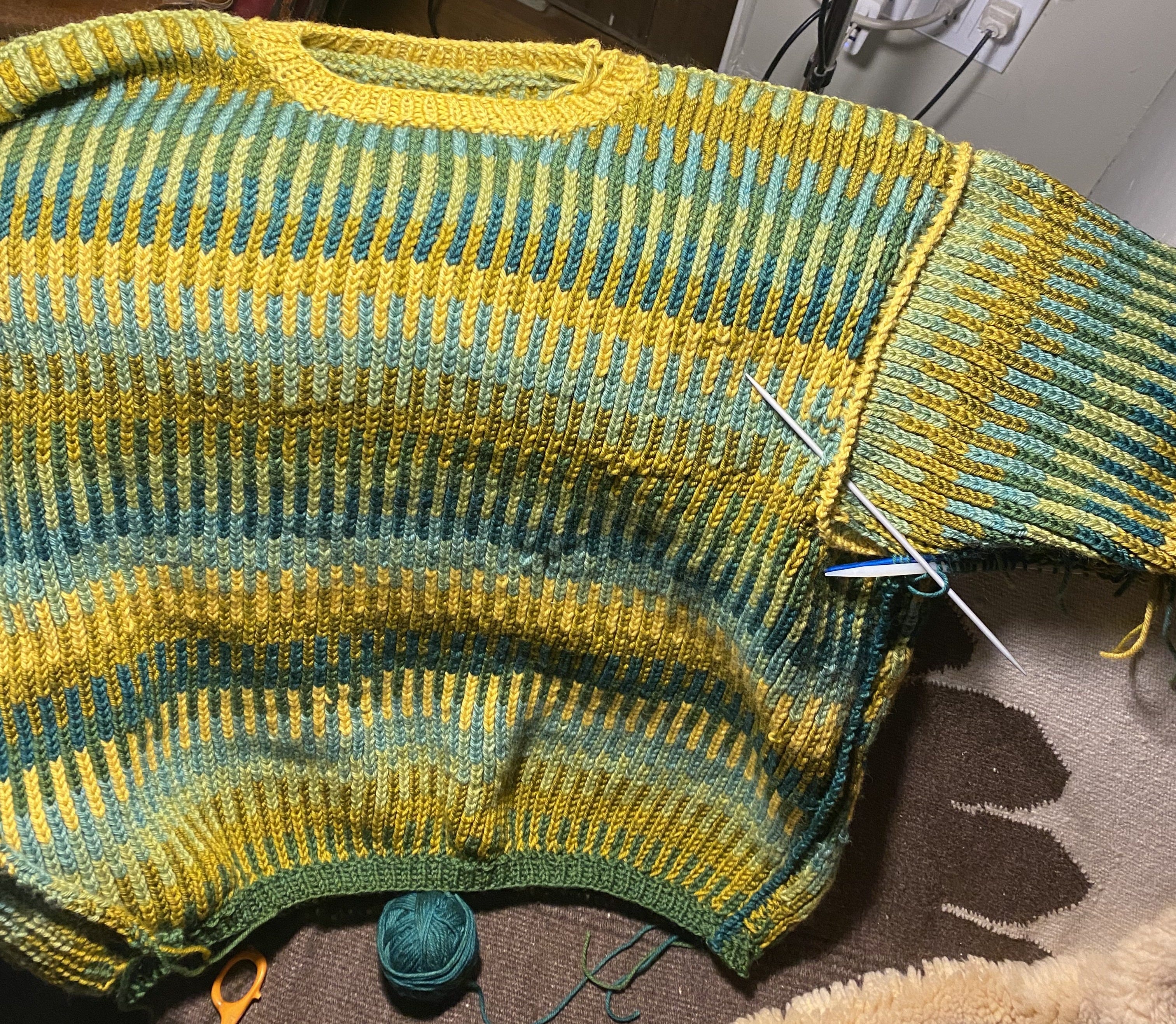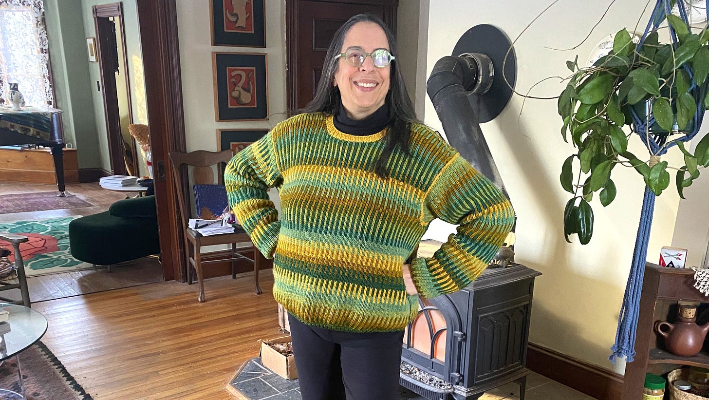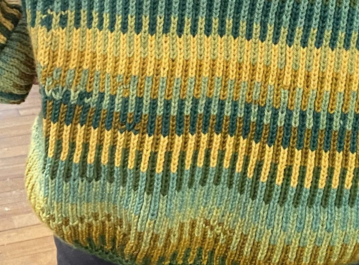 By the end of Strike Day, completion was so near that Saturday morning the knitting continued. But each step towards the finishing line required hundreds of stitches. Hours went by as I picked up stitches to knit the sides and arms together, then adding ribbing to the ends of the sleeves, the bottom of the sweater, and around the neck — each in a different color. At one point, I had to rip out the yellow neck because I’d made it too tight to fit around my head — so I pulled the stitches and carefully cast back on the loops without dropping any, to reknit it!